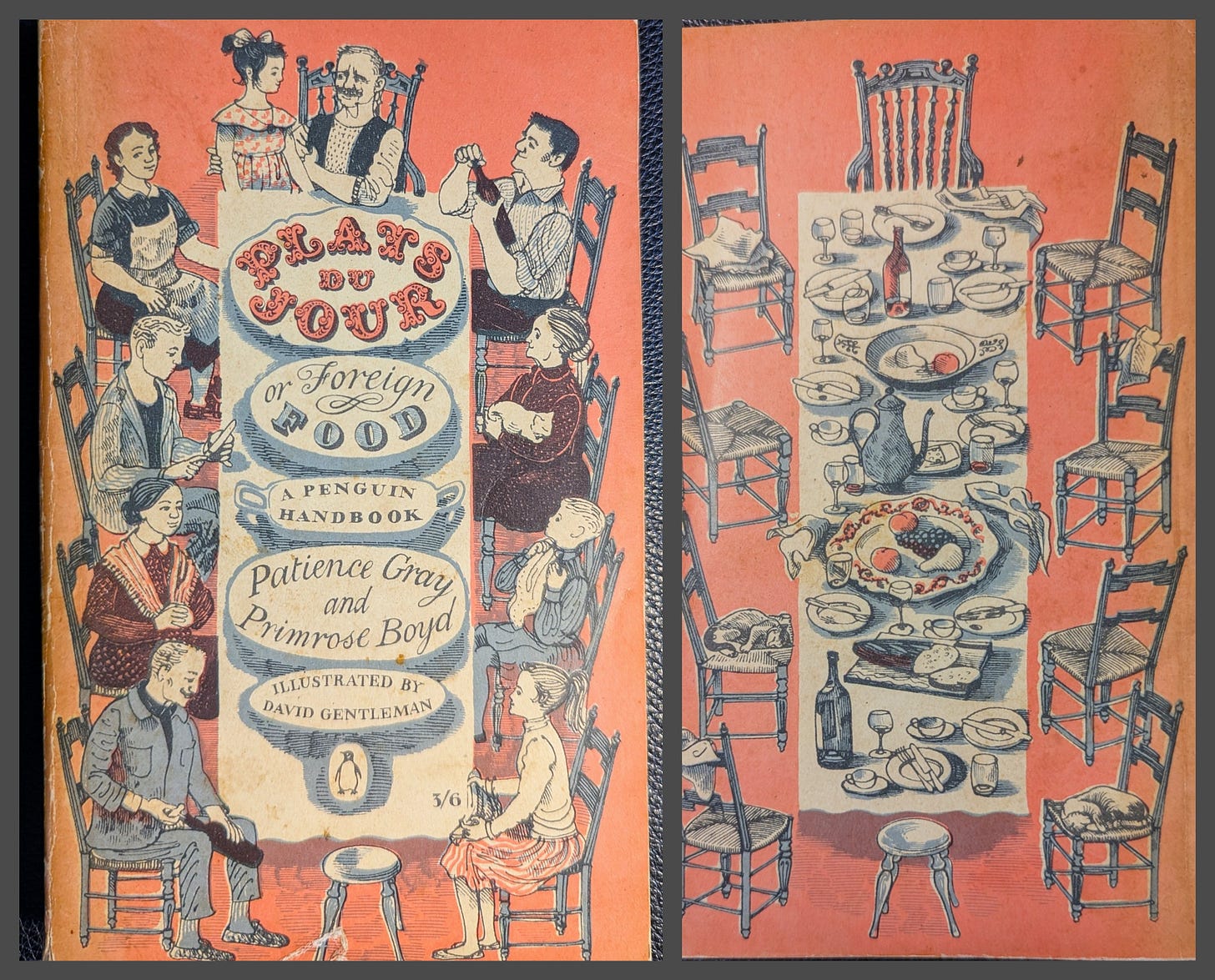 The front and back of the original edition shows a multigeneration, probably French, family with two different wine bottles being corked. Unfortunately the letters on the platters replace the Maine Course (Plat du Jour) in the cover. On the back page, though, we observe the fruit, bread and cheese as well as the sleeping well-fed cats…