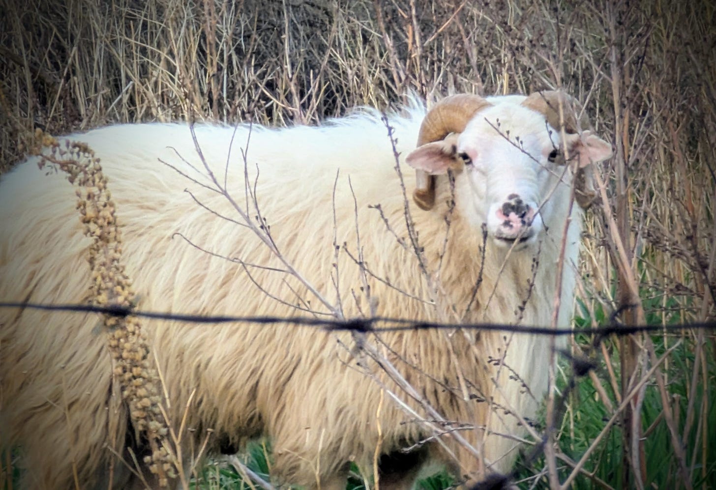 This lovely ram is gravely observing me every morning, as I let the hens out of the coop and feed them.