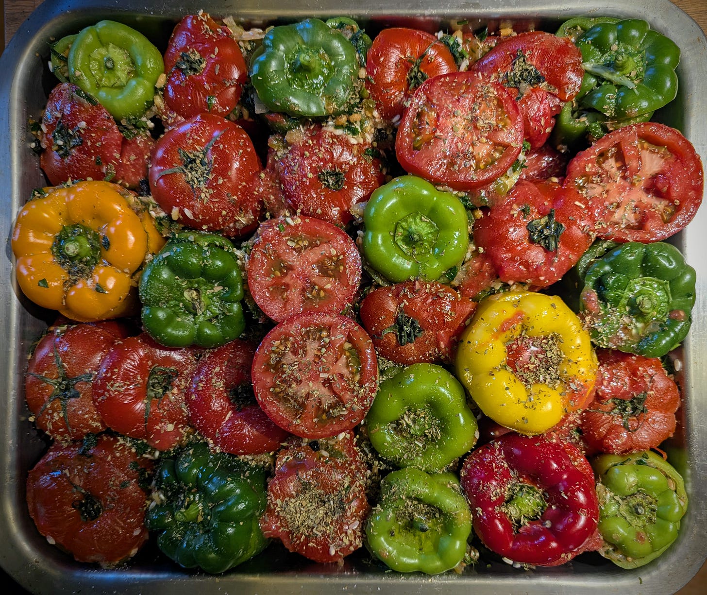 Tomatoes, peppers of all colors, and eggplants covered with tomato slices are stuffed with every bit of the pulp we take emptying them. To these chopped vegetable pieces I add rice, faro, pine nuts, and currants.