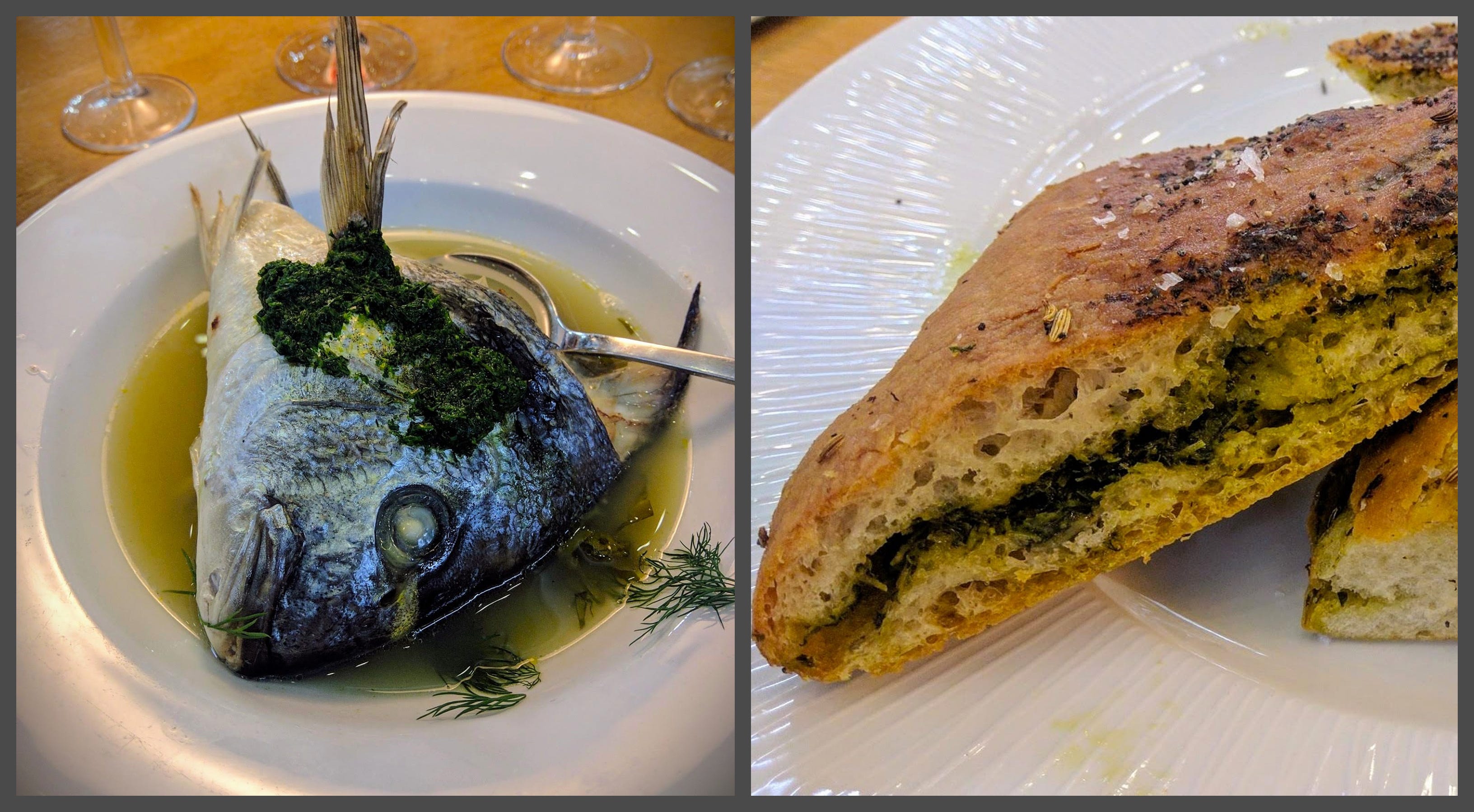 Besides the fish, I still remember the first course, a wonderful flat bread stuffed with all kinds of herbs and greens!