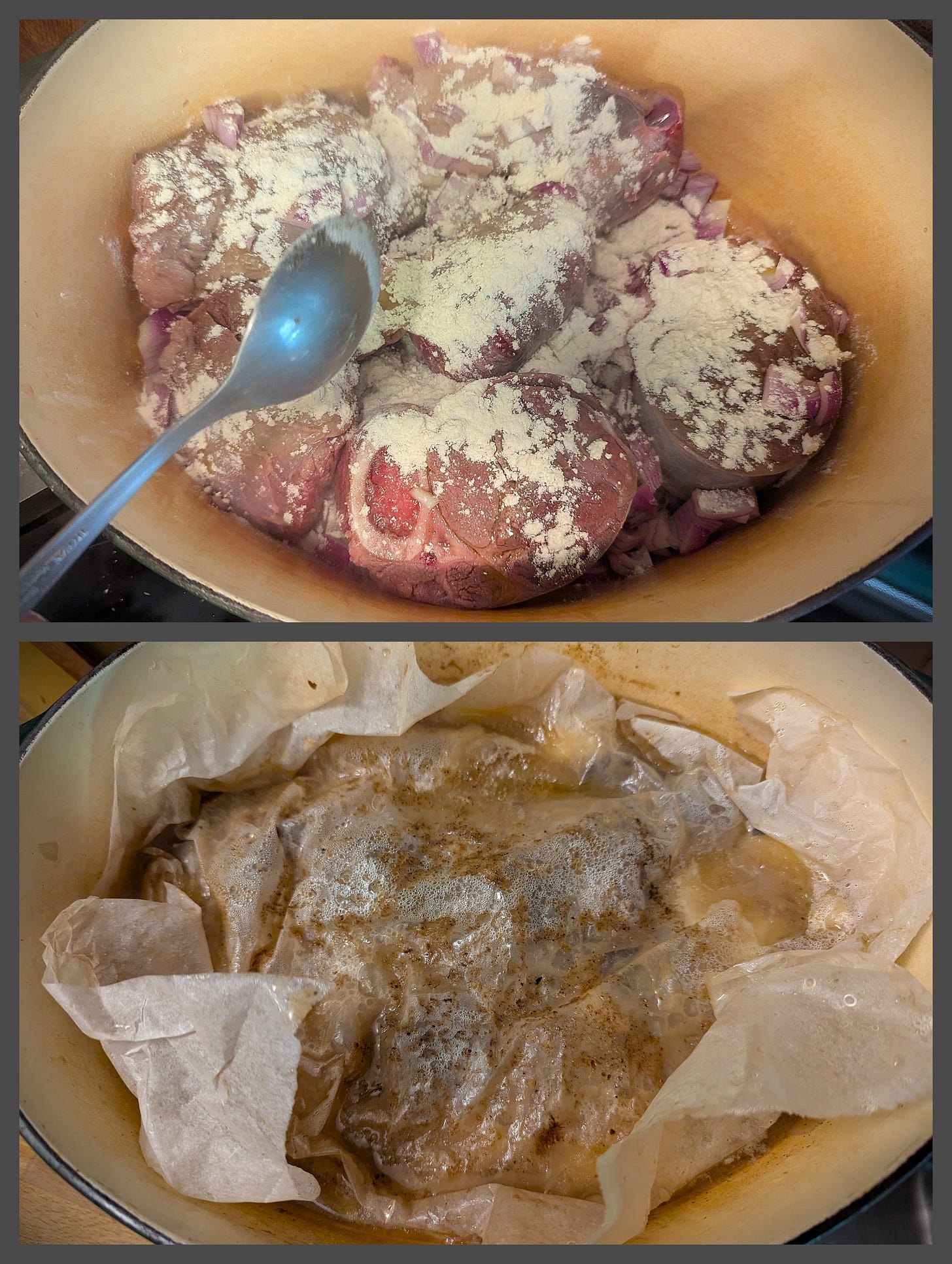 Sprinkle with the flour, turn the meat chanks a few times, and sauté for a few minutes. Pour in the lemon and water, add about 1 teaspoon salt and 1/2 -1 teaspoon freshly ground pepper. Toss and lower the heat so the meat simmers. Cover with a piece of parchment paper and the pot’s cover, and let the meat cook very slowly for 2-3 hours.