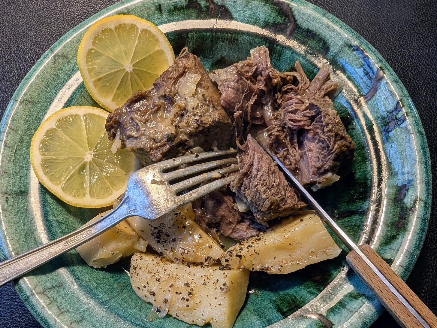 Turn off the heat and let the pot cool overnight. The next morning turn on the heat and simmer for 30 minutes, then check that the meat is almost cooked and tender and add the potatoes in-between the pieces. Simmer for another hour or more and taste. If you find it too lemony add a tablespoon of honey, and more salt and pepper to taste.